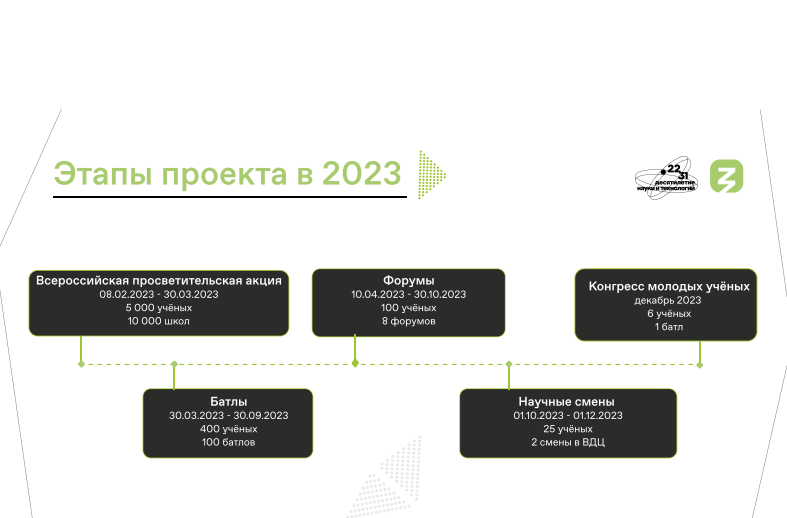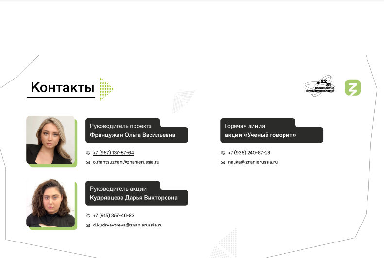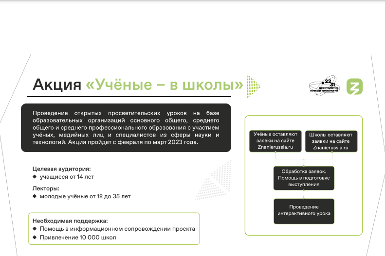 Департамент государственной политики в сфере воспитания, дополнительного образования и детского отдыха Минпросвещения России (далее — Департамент) информирует, что в 2023 году Российским обществом «Знание» совместно с Минпросвещения России запущена Всероссийская акция «Учѐные — в школы» (далее — Акция) для молодых ученых и обучающихся общеобразовательных организаций. Акция направлена на поиск и отбор талантливых лекторов, в рамках которой любой желающий молодой научный деятель может попробовать свои силы в качестве лектора, совершенствовать навыки публичных выступлений, найти свою аудиторию. Образовательные организации могут подать заявку (как площадка) на участие на сайте Акции до 1 февраля 2023 г. (официальный интернет-сайт проекта: https://znanierussia.ru/events/uchenyj-vshko1e-1312).